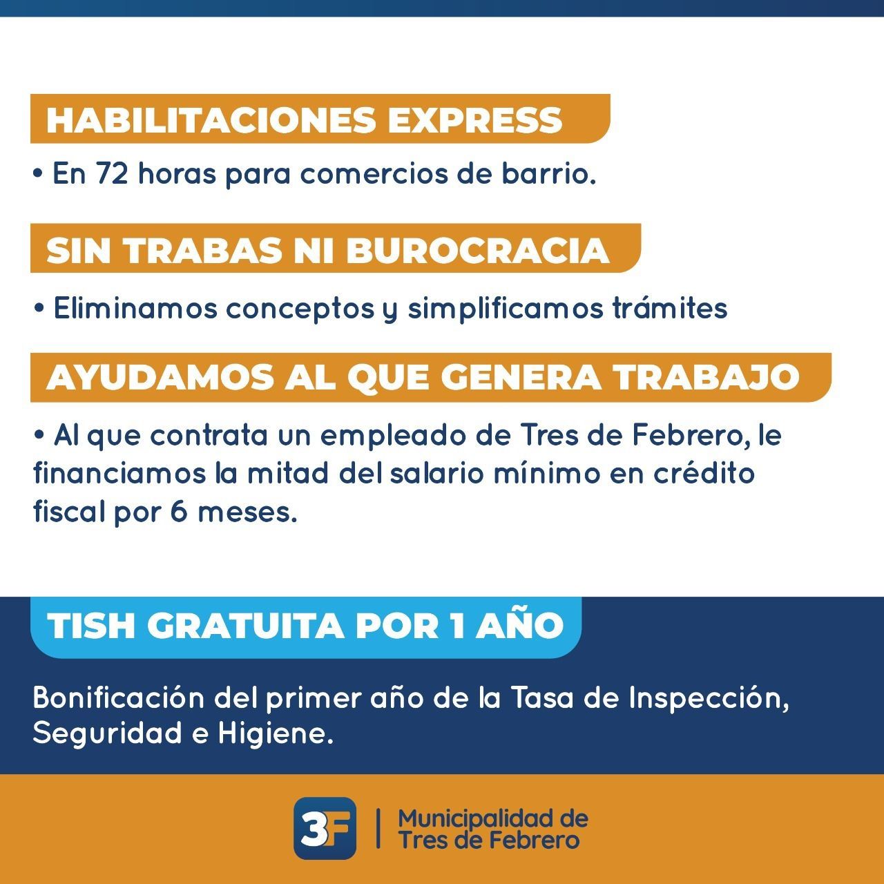 El intendente de Tres de Febrero, Diego Valenzuela, destacó las siguientes medidas: "Las habilitaciones serán gratuitas en 3 de Febrero. Si querés abrir un comercio o una empresa, te decimos gracias y no te cobramos. Además te bonificamos por un año la Tasa de Seguridad e Higiene. Queremos hacerte la vida más fácil, que progreses y generes empleo. Un Estado eficiente, que se pone de tu lado".