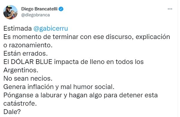 En ese sentido, Brancatelli expresó a través de su cuenta de Twitter: "Estimada Gabriela Cerruti. Es momento de terminar con ese discurso, explicación o razonamiento. Están errados. El DÓLAR BLUE impacta de lleno en todos los argentinos. No sean necios. Genera inflación y mal humor social. Pónganse a laburar y hagan algo para detener esta catástrofe. ¿Dale?