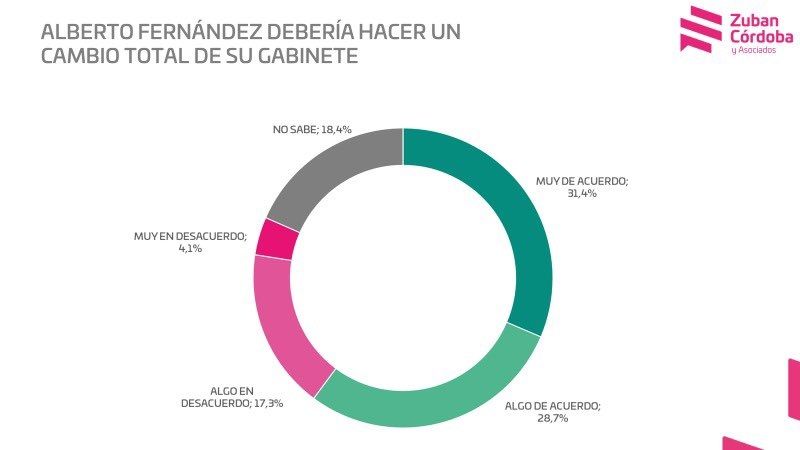 Concretamente, el cristinismo se aferra al último sondeo de la consultora Zurban Córdoba donde aparece un número mayoritario de consultados a favor de de que el presidente implemente cambios en su equipo ministerial. Frente a la pregunta si Fernández debe introducir modificaciones en el Gabinete, un 31,4% se muestra muy de acuerdo, 28,7% algo de acuerdo, 4,1% muy en desacuerdo y algo en desacuerdo 28,7%.