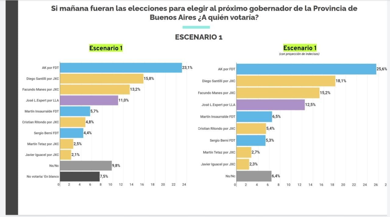 Los candidatos con mayor intención de voto son Axel Kicillof (FdT) con el 23,1%, Diego Santilli (JxC) con el 15,8%, Facundo Manes (JxC) con el 13,2% y José Luis Espert (LLA) con el 11%. De los candidatos del FdT, además de Axel Kicillof, la encuestadora midió a Martín Insaurralde, quien sacó el 5,7% de intención de voto, y a Sergio Berni, con el 4,4% de intención de votos.