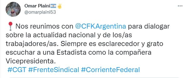 Plaini dijo que se reunió con Fernández de Kirchner "para dialogar sobre la actualidad nacional de los trabajadores".