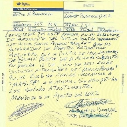"Comunícoles por este medio, en mi carácter de Presidente de MASFE, que las autoridades de Nuestro Partido han resuelto, que a partir de hoy, dejaremos de formar parte de la Alianza suscripta en fecha 12 de julio de 2021 con las distintas autoridades integrantes de CAMBIA MENDOZA", explica la carta.