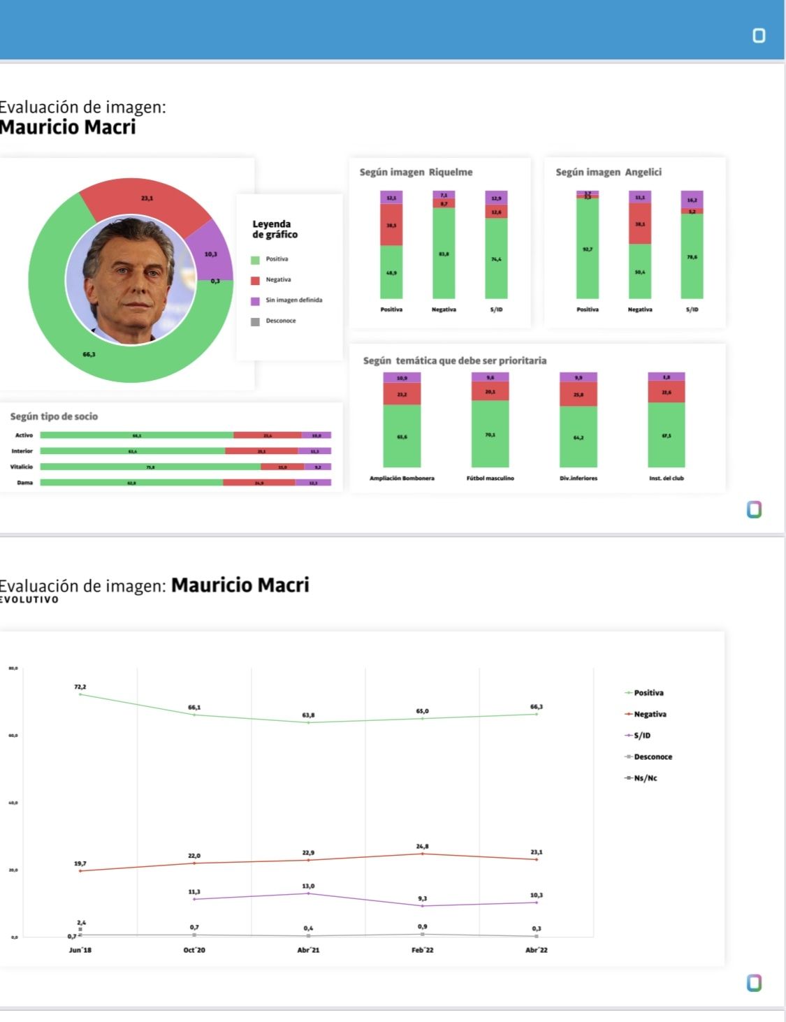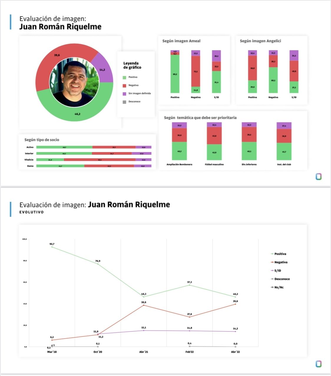 De acuerdo a un sondeo realizado por la consultora Taquion sobre el padrón de socios a pedido del publicista mendocino Jorge Reale, la popularidad del expresidente es realmente contundente. Tiene una imagen positiva del 66,3% y una negativa del 23,1%, mientras que Riquelme tiene actualmente un 46,2% de adhesiones y un rechazo del 39,6% entre los consultados. Pese a ser considerado el ídolo más importante de la historia de la institución, al vicepresidente le han comenzado a entrar las balas por la pésima actuación del plantel profesional de fútbol.