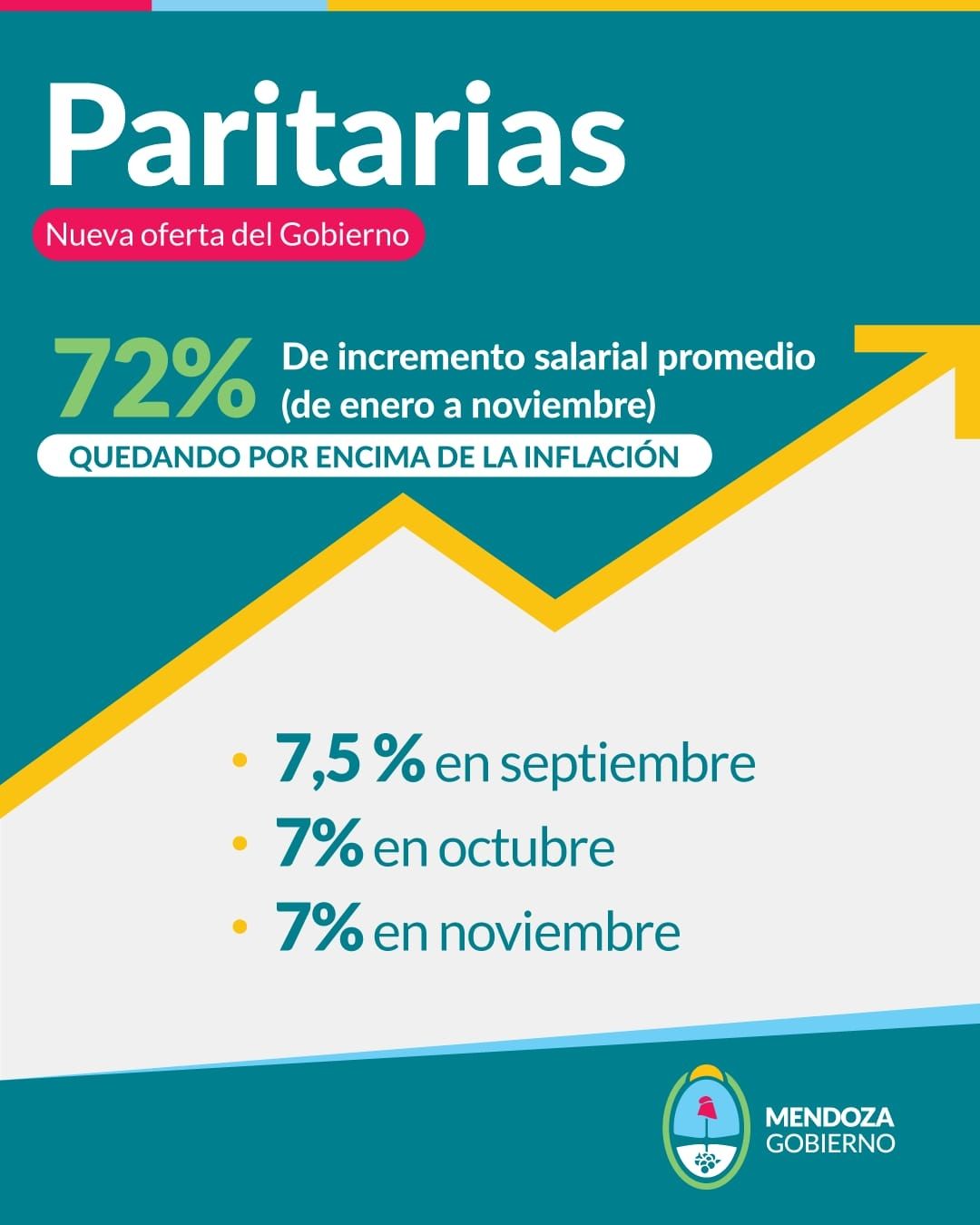 El Gobierno de Mendoza hizo oficial la nueva propuesta de aumento salarial para el Sindicato Unido de Trabajadores de la Educación (SUTE), el gremio más numeroso de la provincia. La propuesta consiste en incrementar los porcentajes de suba previsto para septiembre, octubre y noviembre y destacaron que esto implicaría un incremento del 72%. Los dirigentes sindicales pidieron un cuarto intermedio para discutir si bajan la propuesta a las bases, pero advirtieron que el incremento les parecía escaso.
