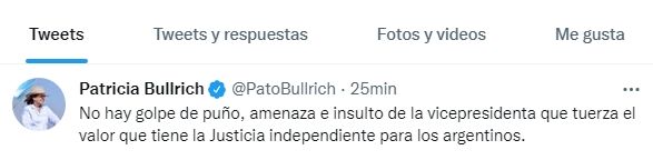 Distintos referentes de la oposición lanzaron sus opiniones en las redes sociales y pidieron Justicia en la causa Vialidad. "No hay golpe de puño, amenaza e insulto de la vicepresidenta que tuerza el valor que tiene la Justicia independiente para los argentinos", dijo Patricia Bullrich al respecto en sus redes minutos después de que Luciani pida doce años de prisión para Fernández de Kirchner.