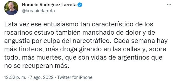 Y después, en relación al crimen de un hombre de 30 años que fue asesinado este sábado en un tiroteo en barrio Ludueña, reflexionó: "Esta vez ese entusiasmo tan característico de los rosarinos estuvo también manchado de dolor y de angustia por culpa del narcotráfico. Cada semana hay más tiroteos, más droga girando en las calles y, sobre todo, más muertes, que son vidas de argentinos que no se recuperan más".