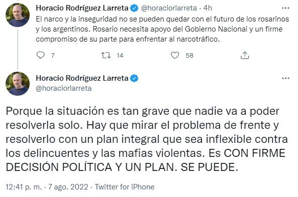 El jefe de de Gobierno de la Ciudad de Buenos Aires, Horacio Rodríguez Larreta, hizo mención a través de sus redes sociales a las numerosas situaciones de violencia vinculadas al narcotráfico en Rosario, Santa Fe. En ese sentido, indicó que la localidad santafesina "necesita apoyo del Gobierno Nacional y un firme compromiso de su parte para enfrentarlo"