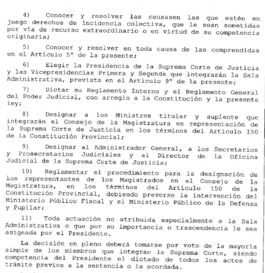 3) Se busca en el proyecto de Ley conocer en "pleno" (usando la mayoría simple de sus Supremos) la competencia en las causas de incidencia colectiva, recordando la importancia que hoy las mismas tienen por ser la herramienta constitucional para la protección de los derechos de los usuarios y consumidores y los derechos ambientales.
