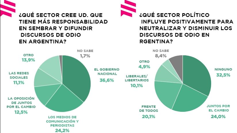 El 36,6% de los encuestados afirmó que la mayor responsabilidad en sembrar y difundir ese odio recae sobre el Gobierno de Alberto Fernández. El 24,2% apuntó contra los medios de comunicación. Este dato contrasta con la lectura que hace el kirchnerismo de la realidad y las acusaciones que desde ese espacio realizan contra Juntos por el Cambio.