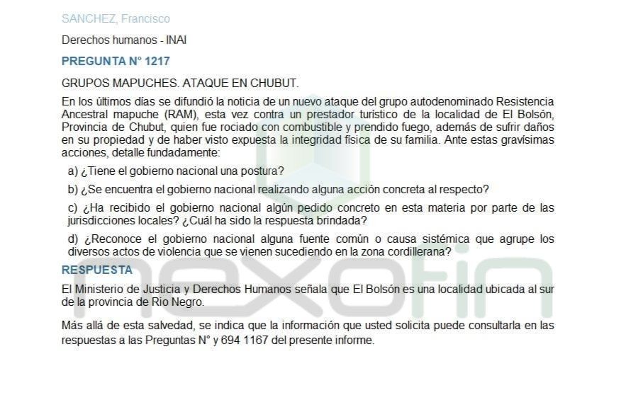 Por ello, Manzur lo corrigió y aclaró: "El Ministerio de Justicia y Derechos Humanos señala que El Bolsón es una localidad ubicada al sur de la provincia de Río Negro. Más allá de esta salvedad, se indica que la información que usted solicita puede consultarla en las respuestas a las preguntas 694 y 1167 del presente informe".