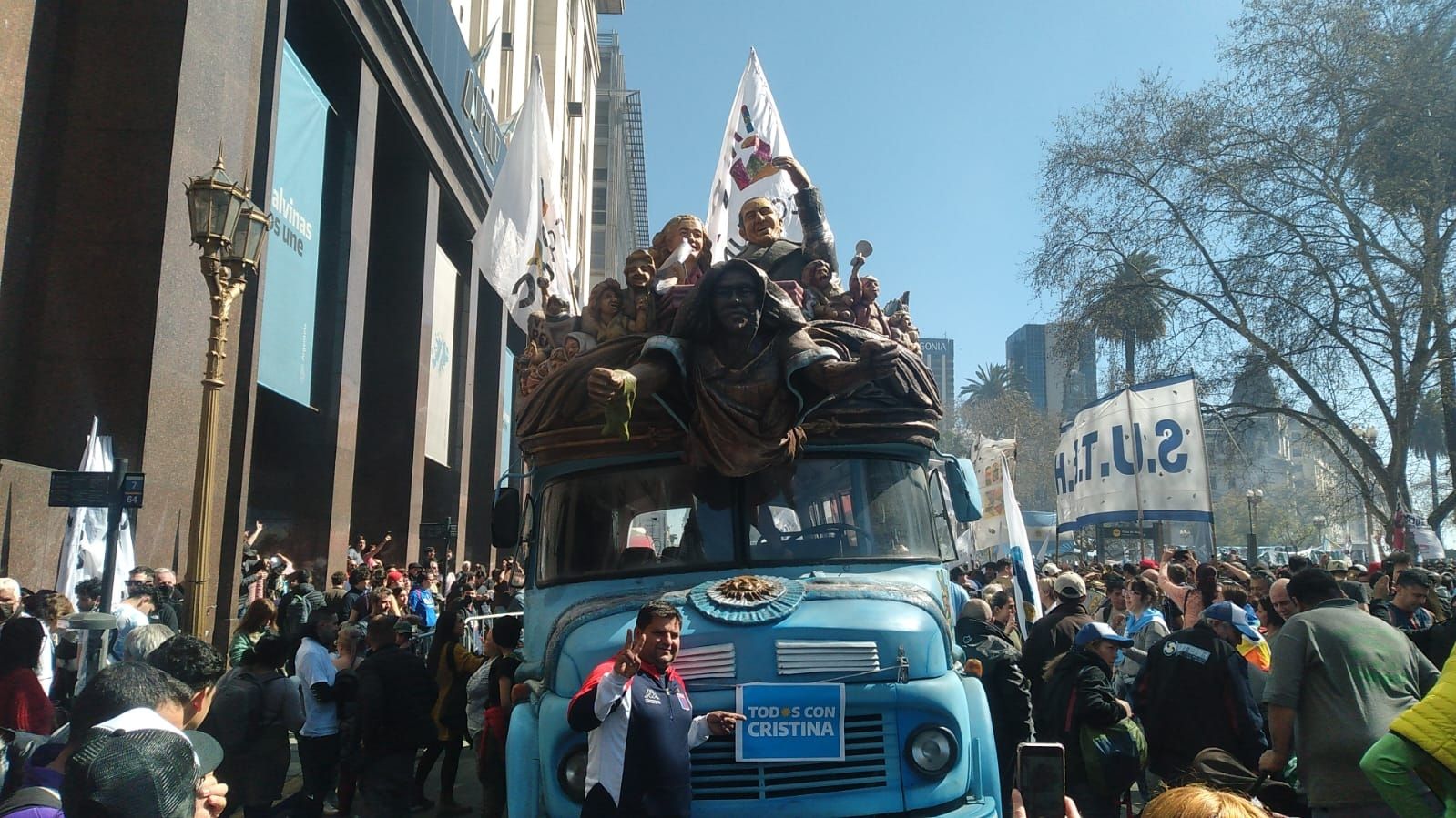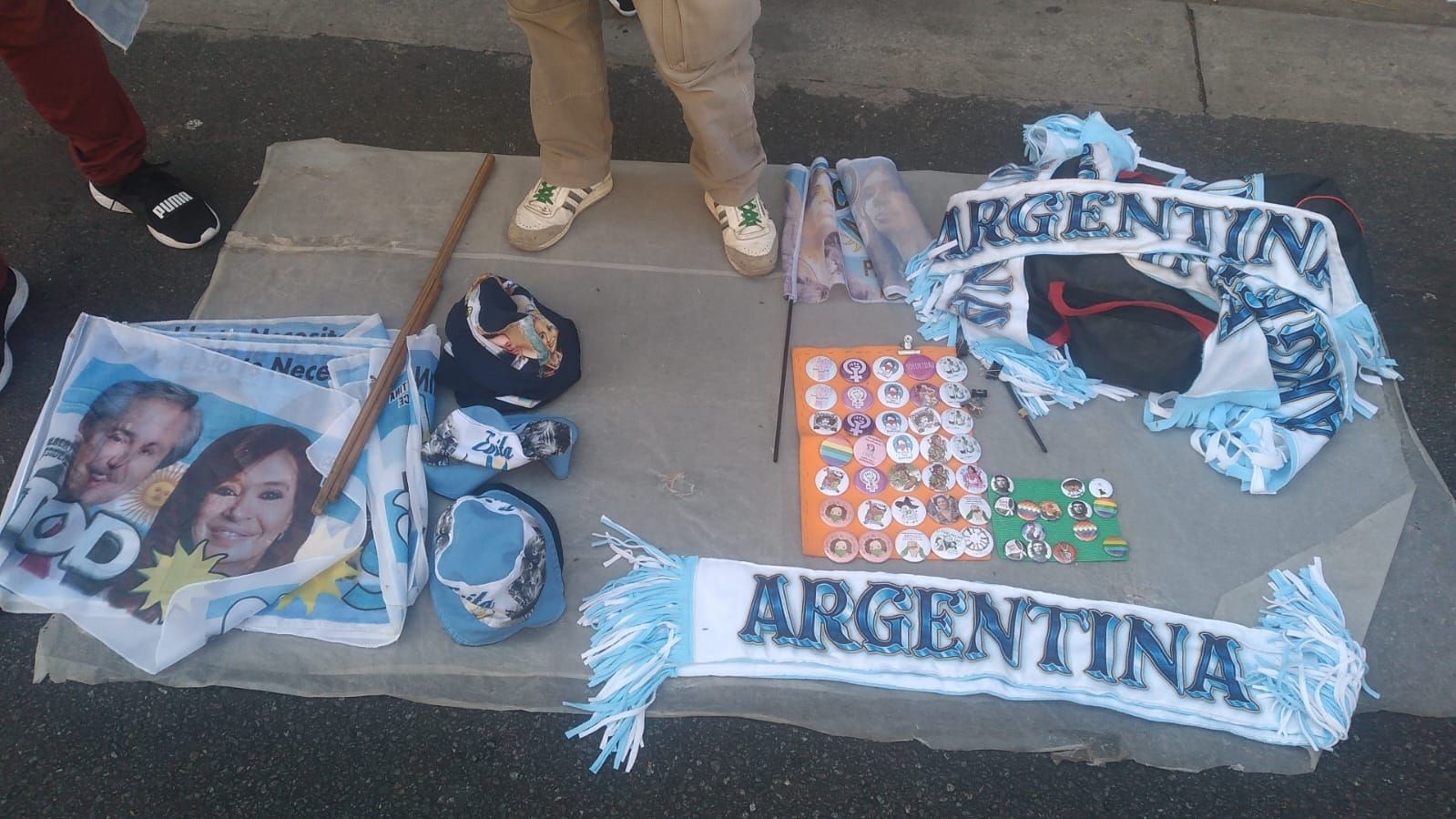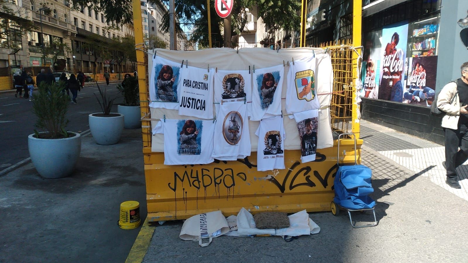 En cuanto al merchandising Nacional y Popular, en en Diagonal Norte se encuentran algunos puestos. Muestran pedidos de justicia para la referente justicialista que enfrenta la acusación por liderar una asociación ilícita desde la Casa Rosada.