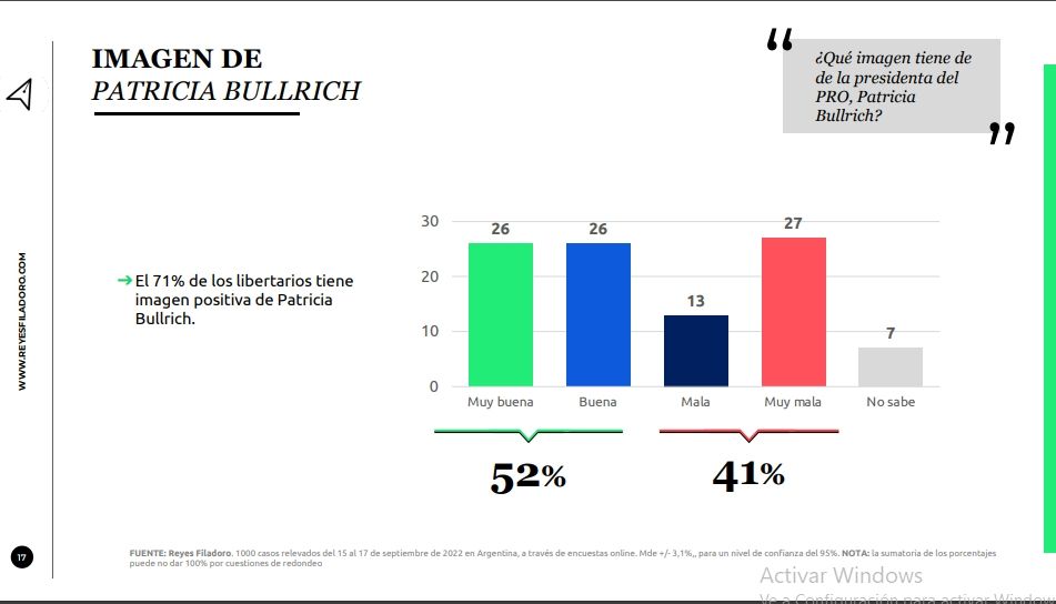 La encuesta de Reyes Filadoro realizada en septiembre revela además que el 71% de los libertarios tiene imagen positiva de Patricia Bullrich. Pero la ex Ministra de Seguridad también cosecha apoyos entre el electorado de Mauricio Macri. El 92% de las personas que tiene imagen positiva del ex presidente, tiene imagen positiva de Patricia Bullrich mientras que el 72% tiene imagen positiva de Larreta.