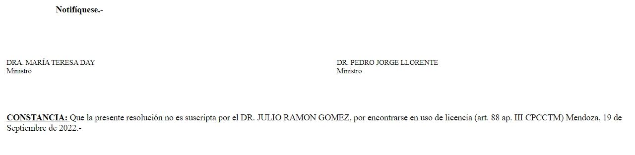 "Constancia: Que la presente resolución no es suscripta por el dr Julio Ramón Gómez por encontrarse en uso de licencia (Art 88 ap.III CPCCTM)", se puede leer en una resolución judicial de la Sala I del 19 de septiembre. La misma solo la firmaron Teresa Day y Pedro Llorente, los otros jueces que la integran.