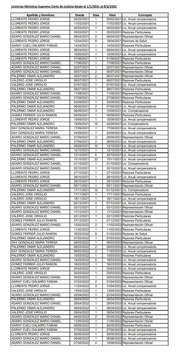 Según consta en el informe de licencias que solicitó MDZ, existen diferentes motivos por los cuales los magistrados se ausentan. Licencias compensatorias por días trabajados (durante los 30 días de feria de enero o los 15 de la feria de invierno), licencias por razones particulares, licencias médicas y licencias por representación oficial.