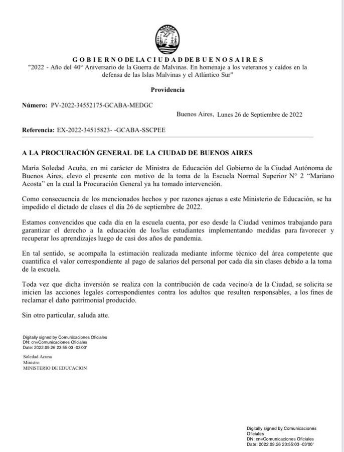 El lunes, Acuña había informado que se realizaron denuncias penales contra los padres de los alumnos que realizaron la medida de fuerza. En ese marco, los estudiantes aseguraron que se vieron condicionados por las medidas tomadas por el Gobierno de la Ciudad y denunciaron una “persecución política de parte de los medios”.