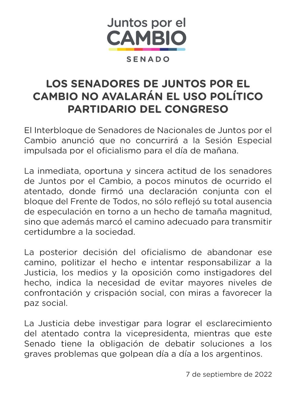 "El Interbloque de Senadores de Nacionales de Juntos por el Cambio anunció que no concurrirá a la Sesión Especial impulsada por el oficialismo para el día de mañana. La inmediata, oportuna y sincera actitud de los senadores de Juntos por el Cambio, a pocos minutos de ocurrido el atentado, donde firmó una declaración conjunta con el bloque del Frente de Todos, no sólo reflejó su total ausencia de especulación en torno a un hecho de tamaña magnitud, sino que además marcó el camino adecuado para transmitir certidumbre a la sociedad", resaltaron en un comunicado compartido en las redes sociales.