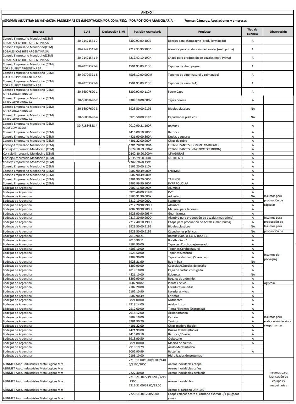 En el listado aparecen desde válvulas antisísmicas, hasta cilindros neumáticos, bridas, bujes, corchos, chapas para producción de bozales, ácido tartárico, bozales de aluminio, botellas, papel para etiquetas, ácido cítrico, barricas, acero al carbono, aceros inoxidables, entre otras.