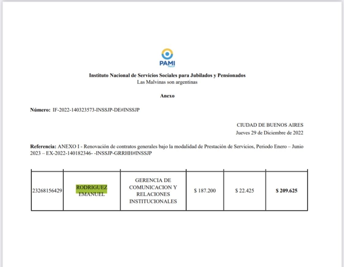 El caso más emblemático de los polémicos nombramientos en el PAMI es el del youtuber kirchnerista Emanuel Rodríguez, alias Peroncho, quien se dedica al stand up con bajada de línea K y está contratado por la interventora con un contrato en la Gerencia de Relaciones Institucionales. En la línea de la obra social sostienen que no concurren a esa dependencia del organismo, pero recibe mensualmente 209.625 pesos. El contrato se lo vienen renovando cada seis meses con actualización en el ingreso por el supuesto servicio que presta.