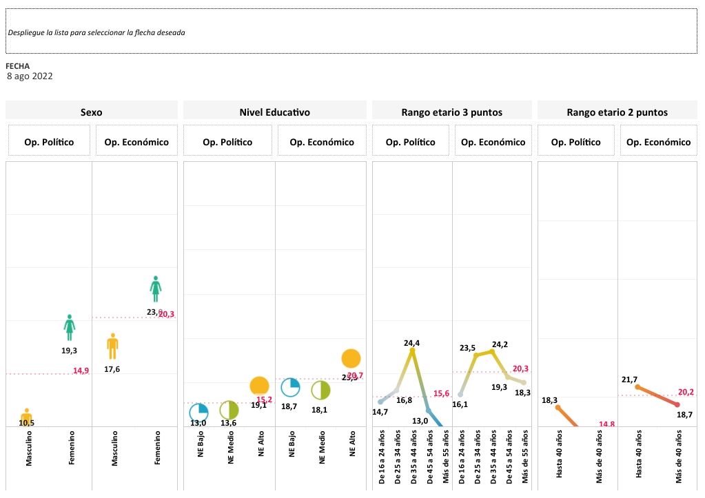 En cuanto al optimismo político, los subíndices que lo componen variaron positivamente: el de clima político actual 3.4 puntos hasta los 17.5 y aquel que mide las expectativas sobre la situación política futura 1.0 hasta los 23.9 puntos.