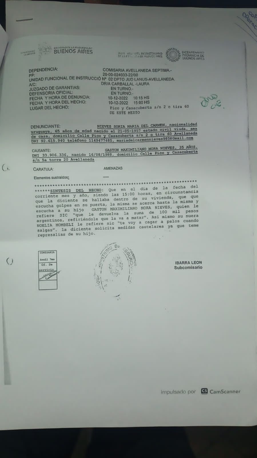 Lo cierto es que la denuncia fue radicada en la Comisaría 7° por su progenitora María del Carmen Nieves Soria, que acusá ante los uniformados a su hijo de haberse apersonado en su domicilio junto a Noelia Mombeli, su nuera, para reclamar por una deuda de 100 mil pesos. El acusado Gastón Mora Nieves le habría advertido a su madre que si no le devolvía el dinero “la iba a matar”; en tanto su pareja le espetó a su suegra que cuando saliera de la casa la iba “a cagar a palos”.