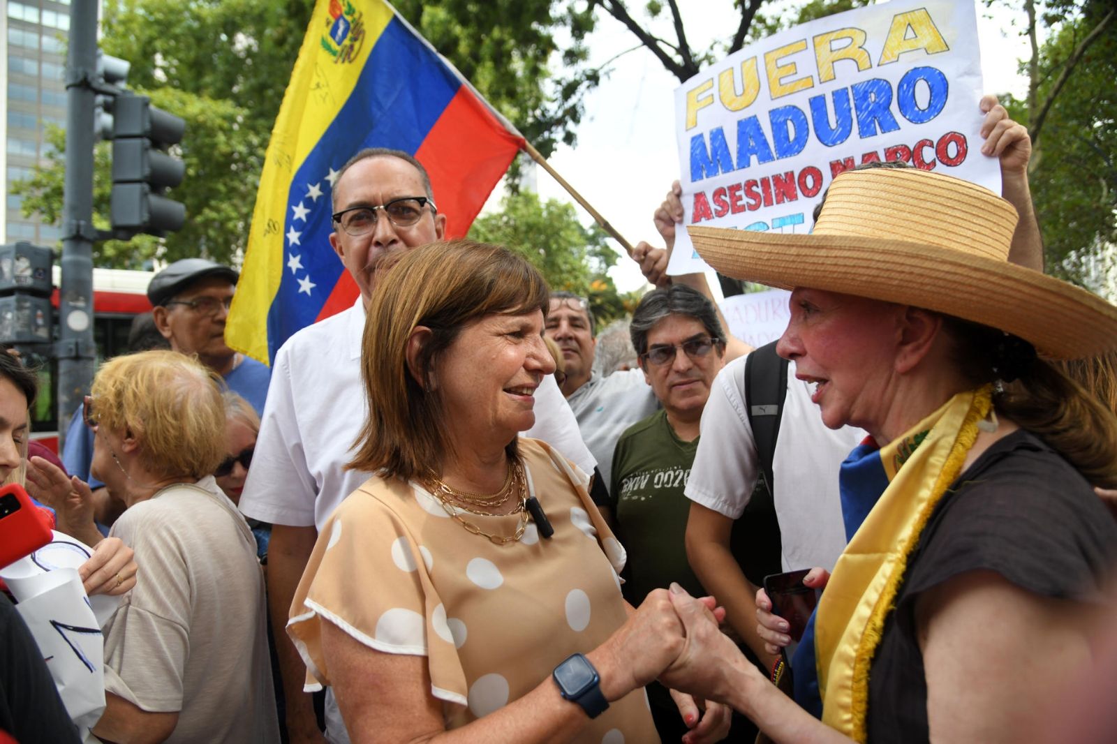 Ante la posibilidad de que Maduro pisara suelo argentino y participara en la cumbre de la Comunidad de Estados Latinoamericanos y Caribeños (Celac), venezolanos residentes en Argentina se manifestaron este domingo por la tarde en las inmediaciones del Hotel Sheraton, de la Ciudad de Buenos Aires, donde Bullrich dijo presente.