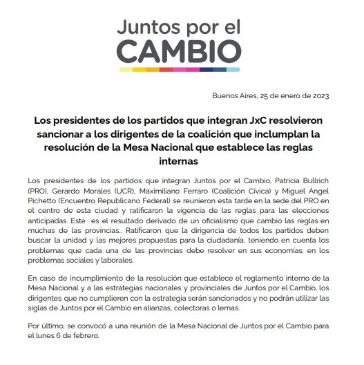 "En caso de incumplimiento de la resolución que establece el reglamento interno de la Mesa Nacional y a las estrategias nacionales y provinciales de Juntos por el Cambio, los dirigentes que no cumplieren con la estrategia serán sancionados y no podrán utilizar las siglas de Juntos por el Cambio en alianzas, colectoras o lemas. Por último, se convocó a una reunión de la Mesa Nacional de Juntos por el Cambio para el lunes 6 de febrero".