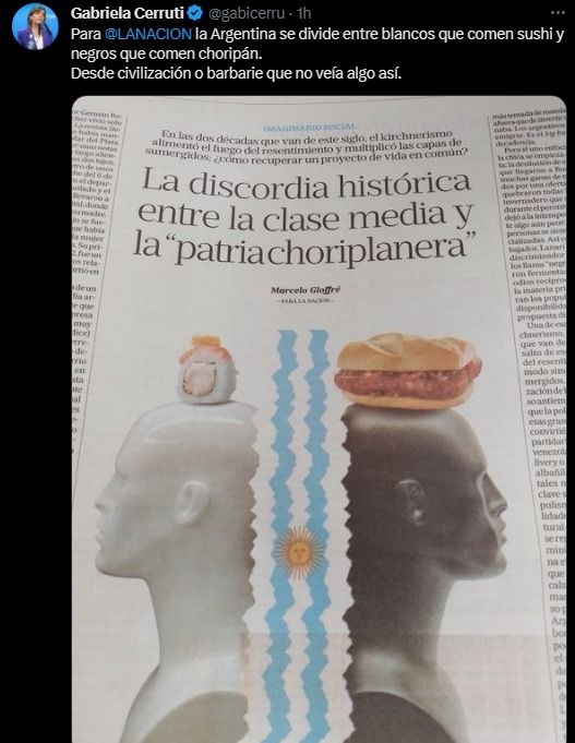 "Para La Nación, la Argentina se divide entre blancos que comen sushi y negros que comen choripán. Desde civilización o barbarie que no veía algo así", se quejó la portavoz presidencial desde su cuenta personal de Twitter.