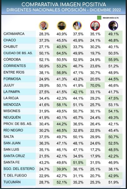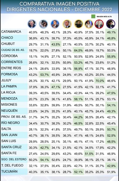 Pero lo que más llama la atención, es que en provincias como Córdoba encabeza el ránking de imagen positiva con el 55,9% y también lo hace en Catamarca y Chaco, superando incluso a dirigentes del peronismo. También en Salta, San Juan y San Luis, tres provincias del PJ, la imagen más alta la tiene Javier Milei.