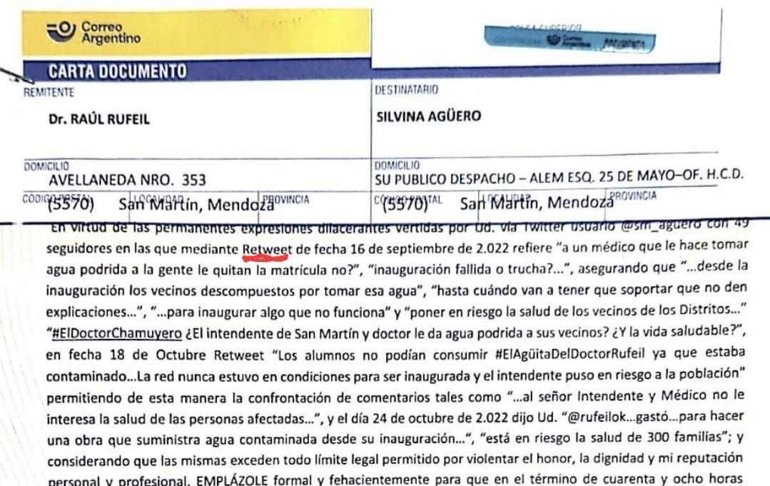 Pero no fue la única carta que mandó. A la concejal del PJ Silvina Agüero le envió un documento similar por retuitear a Cuello. MDZ consultó a la comuna y respondieron: "Algún dirigente del peronismo ha vertido acusaciones contra el médico Raúl Rufeil y él ,en tal condición, además de la de ciudadano, ha enviado la carta documento emplazándolo a ratificar o rectificar", dijeron, sin más comentarios.