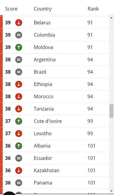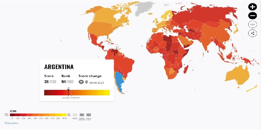 El país conducido por la dupla Alberto Fernández y Cristina Kirchner mantuvo exactamente la misma puntuación del año pasado, es decir un escaso 38 sobre 100, lo que ubica a la Nación en el puesto 94 sobre 180.
