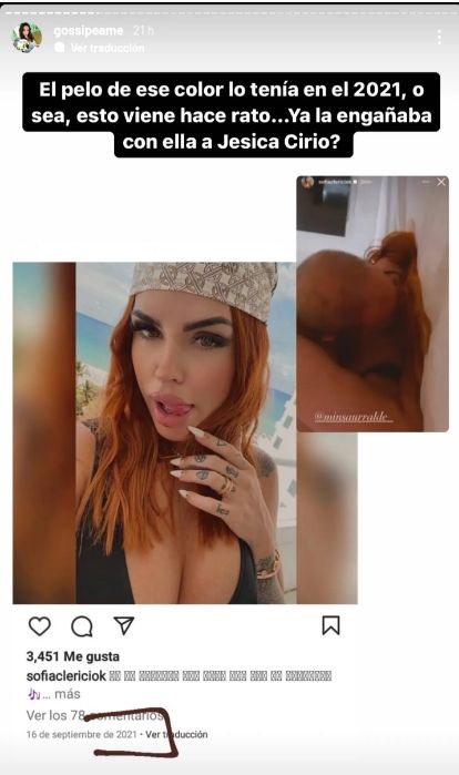 "Esto viene hace rato. ¿Ya la engañaba con ella a Jessica Cirio?", escribió Pochi, la dueña del perfil dedicado a la farándula. A la captura del video la acompaña con otra del perfil de Sofía Clerici donde luce el color de pelo en el año 2021.