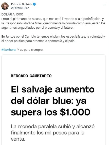 Por su parte, Patricia Bullrich, candidata de Juntos por el Cambio, se refirió a lo ocurrió y expresó a través de sus redes sociales: "Entre el pirómano de Massa, que nos está llevando a la hiperinflación, y la irresponsabilidad de Milei, que fomenta la corrida cambiaria, están los argentinos angustiados por el presente y el futuro".