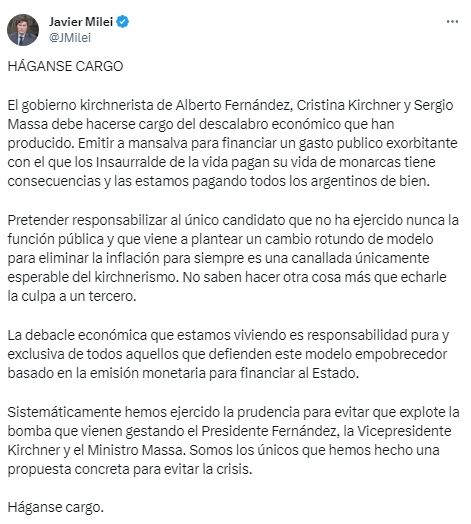 Y añadió: "Pretender responsabilizar al único candidato que no ha ejercido nunca la función pública y que viene a plantear un cambio rotundo de modelo para eliminar la inflación para siempre es una canallada únicamente esperable del kirchnerismo. No saben hacer otra cosa más que echarle la culpa a un tercero. La debacle económica que estamos viviendo es responsabilidad pura y exclusiva de todos aquellos que defienden este modelo empobrecedor basado en la emisión monetaria para financiar al Estado. Sistemáticamente hemos ejercido la prudencia para evitar que explote la bomba que vienen gestando el presidente Fernández, la vicepresidente Kirchner y el ministro Massa. Somos los únicos que hemos hecho una propuesta concreta para evitar la crisis. Háganse cargo".