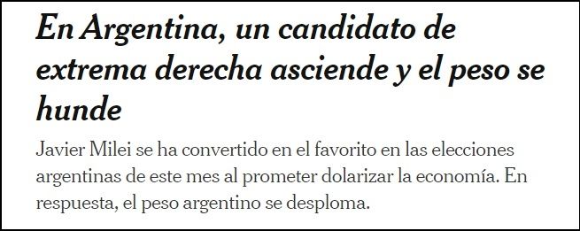 El texto “En Argentina, un candidato de extrema derecha asciende y el peso se hunde” escrito por Jack Nicas señala que el libertario “está provocando él solo un choque financiero en una de las mayores economías de América Latina”.