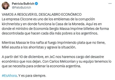 De forma escrita también comunicó que "a partir del 10 de diciembre, en JxC nos haremos cargo del desastre económico que nos dejan. Con Carlos Melconian y su equipo tenemos lo que se necesita para ordenar la economía argentina".
