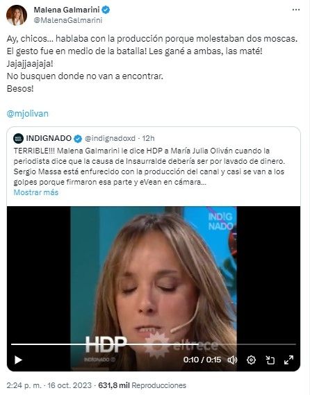 "Ay, chicos…hablaba con la producción porque molestaban dos moscas El gesto fue en medio de la batalla! Les gané a ambas, las maté! No busquen donde no van a encontrar. ¡Besos!", indicó la funcionaria en su cuenta de X.