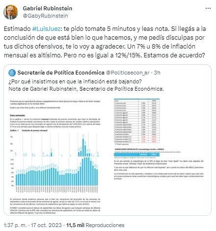 "Espero que esta nota sirva para esclarecer respecto a la tendencia a la baja que detectamos en la tasa de inflación. Un 7% o un 8% mensual de inflación sigue siendo altísimo. Pero no es lo mismo que 12% o 15%", argumentó Rubinstein desde la plataforma X y adjuntó la nota.