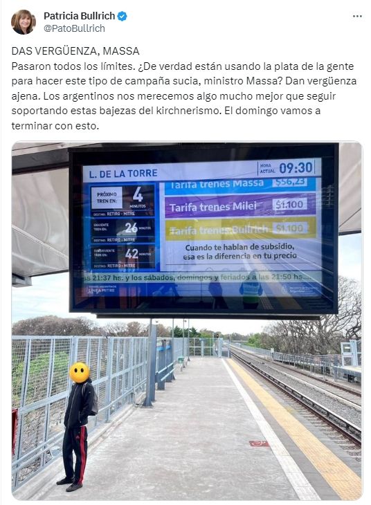 "DAS VERGÜENZA, MASSA. Pasaron todos los límites. ¿De verdad están usando la plata de la gente para hacer este tipo de campaña sucia, ministro Massa?, manifestó Patricia Bullrich en sus redes sociales.