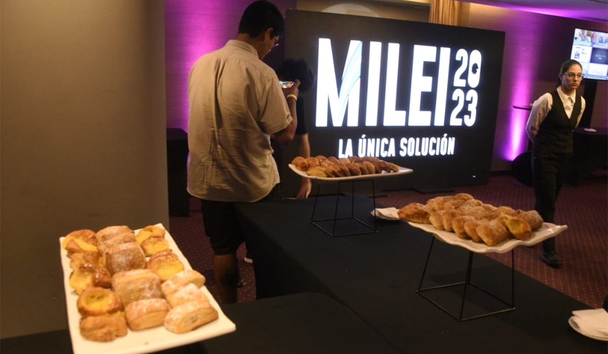 Café, té y facturas, el catering en el búnker de La Libertad Avanza para la prensa a la espera de la llegada de los primeros dirigentes que acompañarán a Javier Milei.