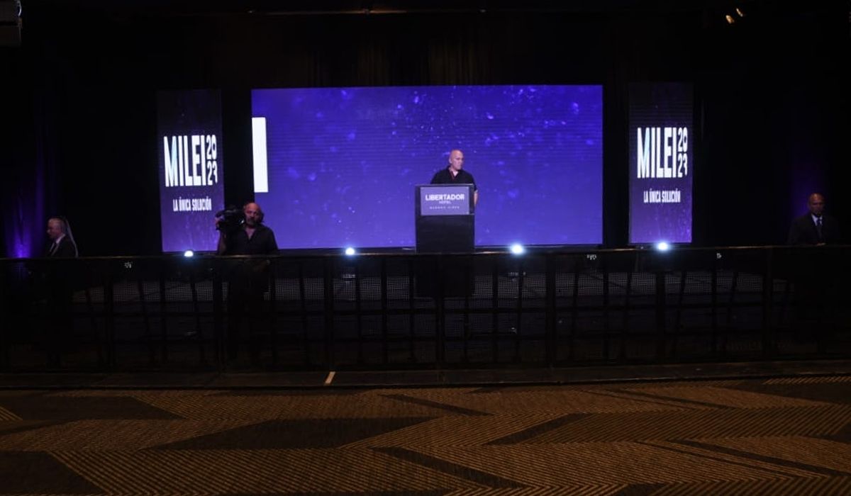 Dentro del búnker de La Libertad Avanza han instalado un escenario con un atril, desde el que se espera que hable el candidato presidencial tras conocerse los primeros resultados de la elección. Hay una valla que separa el escenario de la prensa.