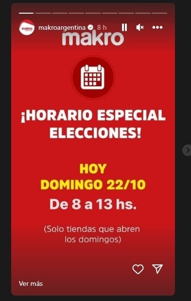 Los supermercados suelen abrir sus puertas con total normalidad los días de elecciones, aunque este domingo el Makro decidió abrir solamente de mañana. "Domingo 22/10 el supermercado estará abierto de 8 a 13 horas", expresaron en una publicación.