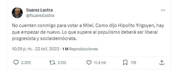 Pero en el radicalismo hay quienes ya anticiparon que no están dispuestos a respaldar a un Javier Milei que arenga al grito de "el que no salta es radical". "No cuenten conmigo para votar a Milei. Como dijo Hipolito Yrigoyen, hay que empezar de nuevo. Lo que supere al populismo deberá ser liberal progresista y socialdemócrata", disparó Facundo Suarez Lastra en las redes reflejando el sentir de varios integrantes de la UCR.