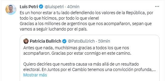 "Es un honor estar a tu lado defendiendo los valores de la República, por todo lo que hicimos, por todo lo que viene. Gracias a los millones de argentinos que nos acompañaron, sepan que vamos a seguir luchando por el país", escribió Luis Petri y compartió las palabras de Bullrich. "No vamos a negociar nuestros valores: la lucha contra el populismo empobrecedor y la corrupción", remarcó.