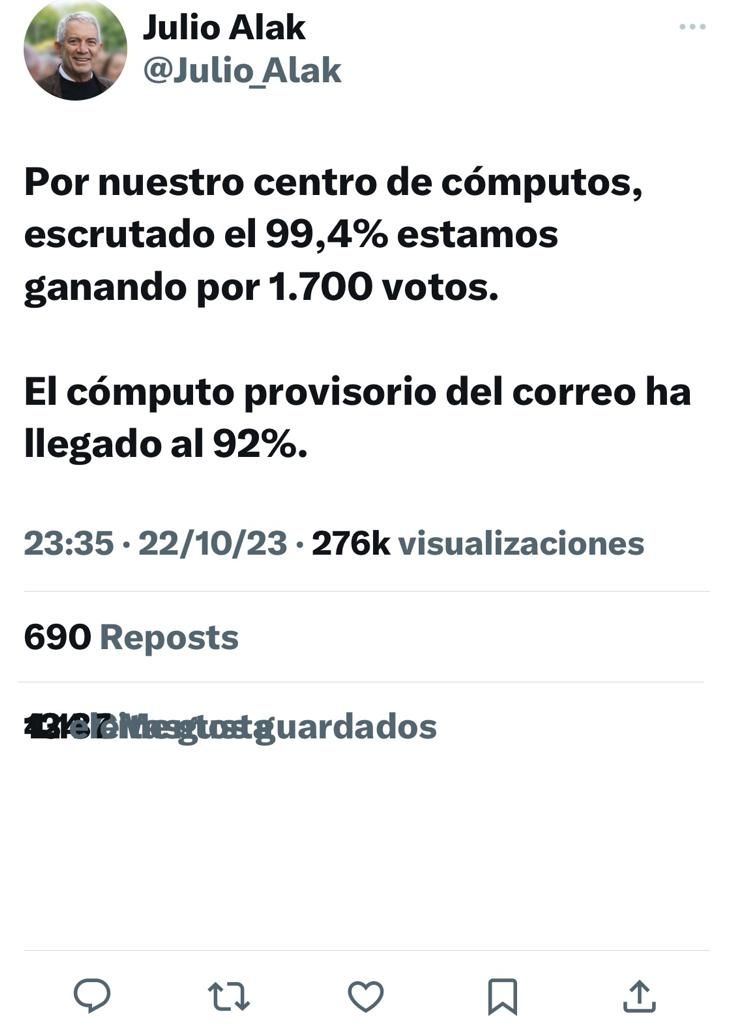 Ambos candidatos se atribuyen, en redes sociales, el triunfo. Julio Garro afirmó que los datos de su centro de cómputos le dan una diferencia de 1.496 votos; mientras que Julio Alak sostiene que se impuso por 1.700 sufragios; por lo que en el escrutinio definitivo se resolverá la cuestión.