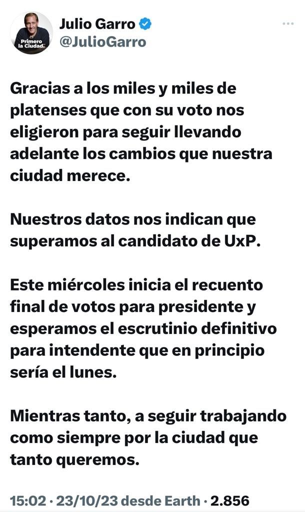 Ante la consulta de MDZ de a qué barrios correspondían las urnas que faltaban cargar, afirmó que en su gran mayoría son de la zona norte y del casco urbano, lugares donde en las PASO Garro obtuvo un rotundo triunfo y ahora habría repetido esa performance. En ese sentido, añadió: “Sabíamos que iba a ser una elección compleja. No me gusta que esto pase para el miércoles, pero estamos hablando de 20 centésimas, por eso quiero ser cauto. Es una elección muy reñida, muy ajustada, así que habrá que esperar. Yo estoy seguro de que, con la información que manejamos, vamos a ganar”.