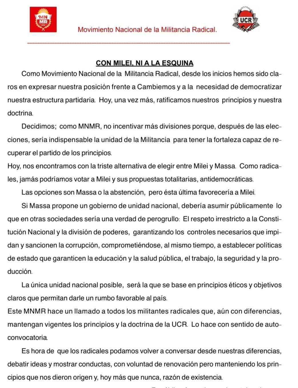 "Hoy, nos encontramos con la triste alternativa de elegir entre Milei y Massa. Como radicales, jamás podríamos votar a Milei y sus propuestas totalitarias, antidemocráticas. Las opciones son Massa o la abstención, pero esta última favorecería a Milei", sostienen en el documento.