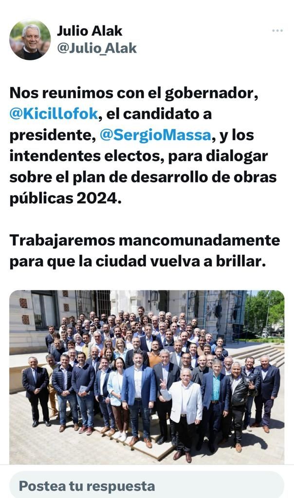 A todo esto, Julio Alak, ministro de Justicia de la provincia y candidato a intendente de Unión por la Patria, ya se mueve como el intendente electo de La Plata. Este jueves participó del encuentro que tuvo el gobernador, Axel Kicillof y el ministro de economía y candidato a presidente Sergio Massa con los intendentes electos de Unión por la Patria, donde se puso el eje en las obras publicas de los municipios para el próximo año.