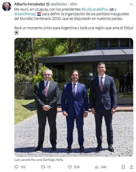 "Me reuní, en Uruguay, con los presidentes @LuisLacallePou y @SantiPenap para definir la organización de los partidos inaugurales del Mundial Centenario 2030, que se disputarán en nuestros países. Será un momento único para Argentina y toda una región que ama el fútbol", publicó en su cuenta de X el presidente Alberto Fernández.