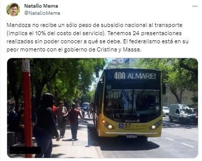 Ante esta información, el secretario de Servicios Públicos de la provincia, Natalio Mema, indicó: “Mendoza no recibe un sólo peso de subsidio nacional al transporte (implica el 10% del costo del servicio). Tenemos 24 presentaciones realizadas sin poder conocer a qué se debe. El federalismo está en su peor momento con el gobierno de Cristina y Massa”.