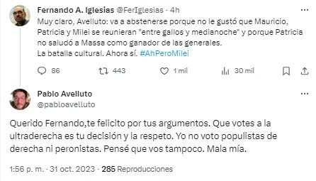 El exfuncionario no se quedó callado y replicó: "Querido Fernando (Iglesías), te felicito por tus argumentos. Que votes a la ultraderecha es tu decisión y la respeto. Yo no voto populistas de derecha ni peronistas. Pensé que vos tampoco. Mala mía".